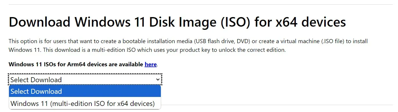 Go straight to the Download Windows 11 Disk Image (ISO) for x64 devices, as seen in the screenshot below. If your device is ARM, and not x64, the process is the same.