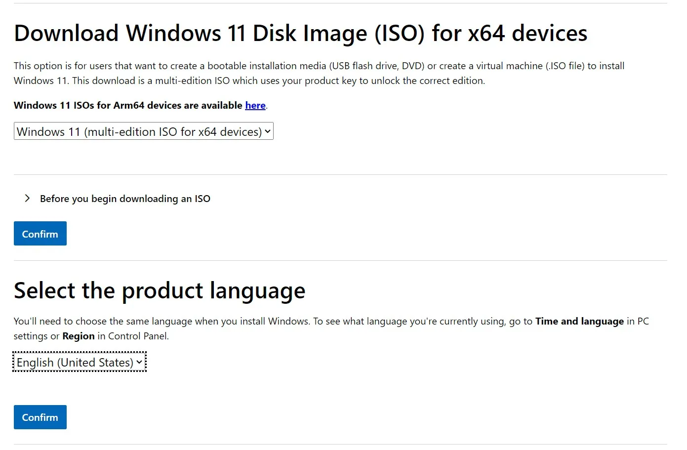 After your request is validated, choose your product language. For this guide, we’ll go with English (United States), but you can choose any language. After confirming again, you can click the 64-bit Download to get your official Win11_25H2_English_x64.iso installation file.