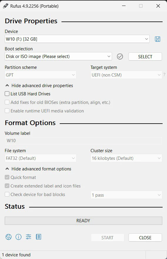 Now, you have your .iso somewhere locally, and Rufus on your screen. It looks something like this→