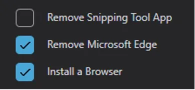 – Warning – if you choose “Remove MS Edge” and don’t check “Install a Browser”, you won’t have a browser (if you wanna go full portable, have a browser at the ready).