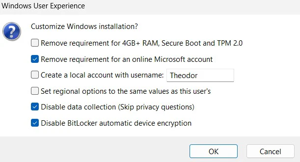 2.3) When you’ll click start (do it now), you will get the “gotcha windows” screen, as I like to call it. Implemented by Rufus since Windows 11 launched – it gives us some options to play with: