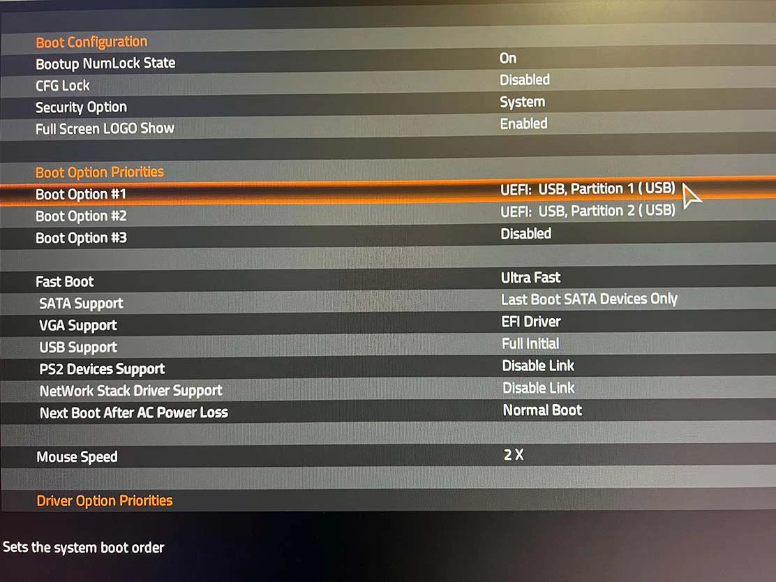 You’ll find a boot option priority setting. Make sure our USB installation drive is visible, and place it as the first option. Partition 1, always – Partition 2 is a FAT32 made just to address some UEFI stuff.