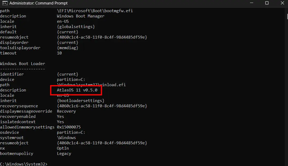 You’ll see the current windows boot settings. See that the description flag in Windows Boot Loader is “AtlasOS 11 v0.4.1”.