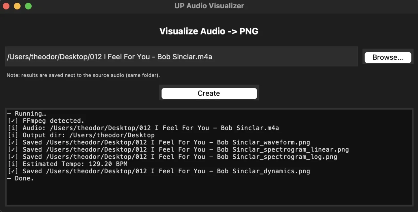 Turn sound into .png visuals and a clear .txt report – fully in your control.