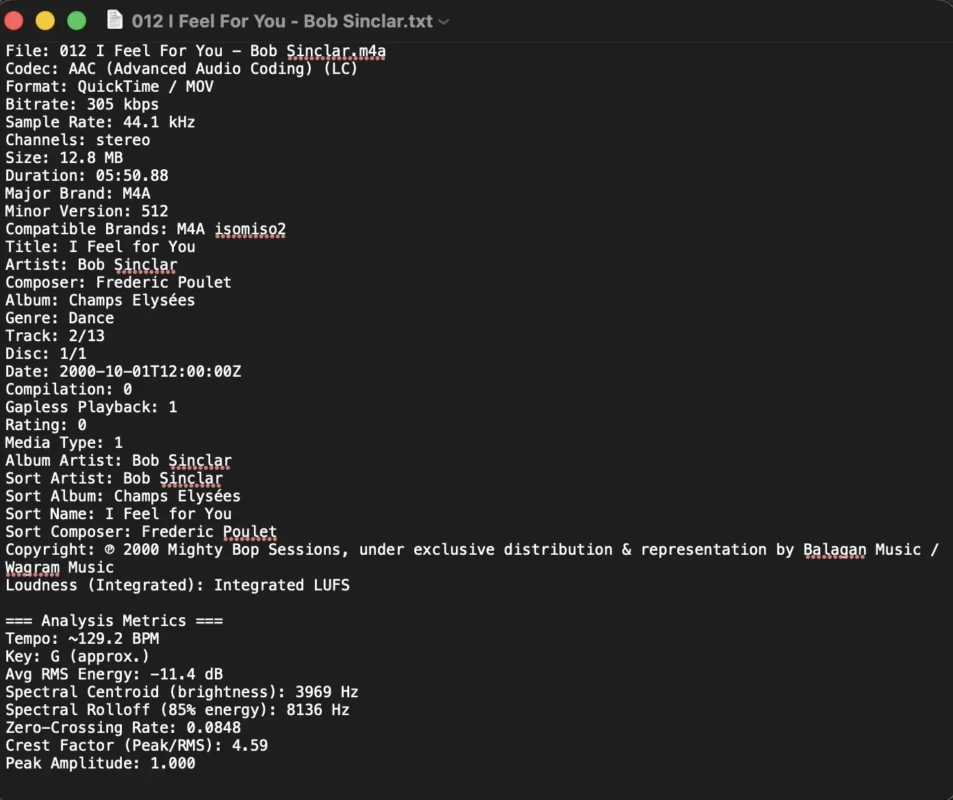 6. .txt report (codec, tags, duration, bitrate, channels, size, lyrics), plus LUFS via ebur128